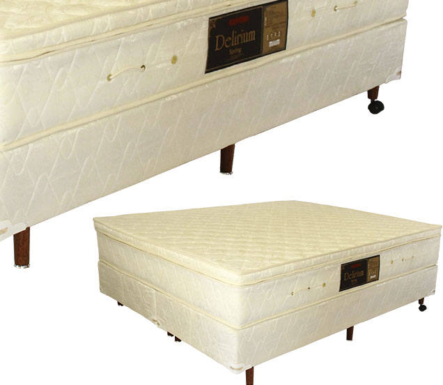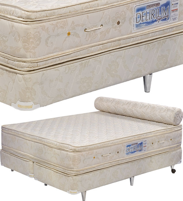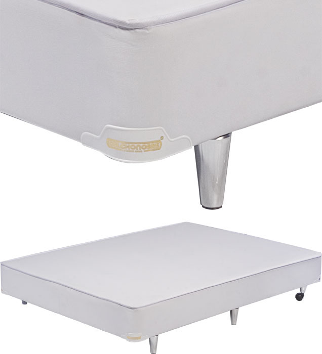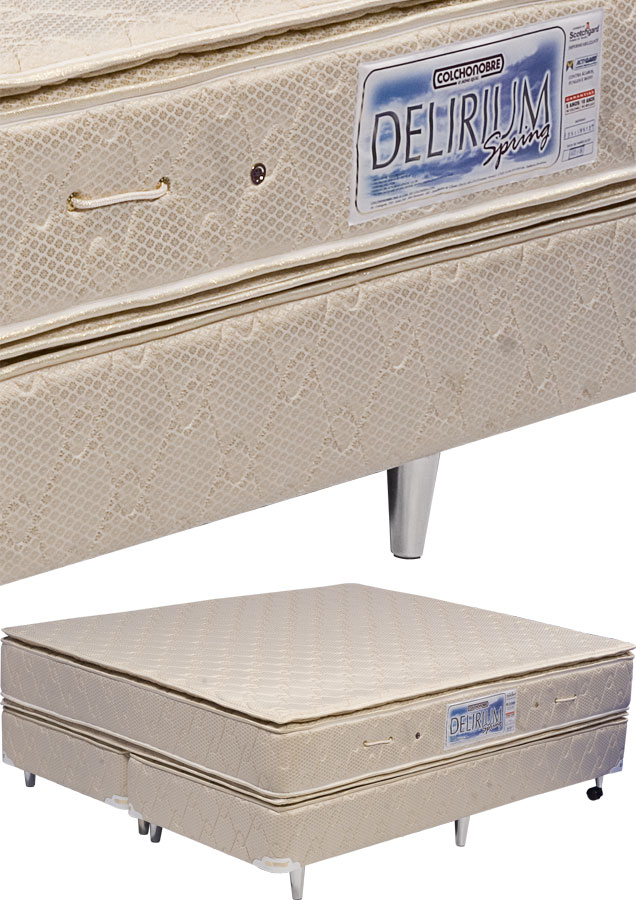 Composição Têxtil: Colchão: 35% polipropileno e 65% poliéster, Jacquard em matelassê, com tratamento antiácaro e impermeabilizante. Conteúdo: molas de aço temperado tipo Bonnel, com Edge Clip nas laterais, feltro sintético, espuma de poliuretano D33, alças e respiros laterais. Alturas: 24 e 27cm (Pillow Top). Box: estrutura de madeira reforçada, espuma de poliuretano e tecido 35% polipropileno e 65% poliéster em matelassê, pés de madeira envernizados padrão marfim, com sapatas niveladoras e com rodízios. Opção de pés cromados. Altura: 36cm.